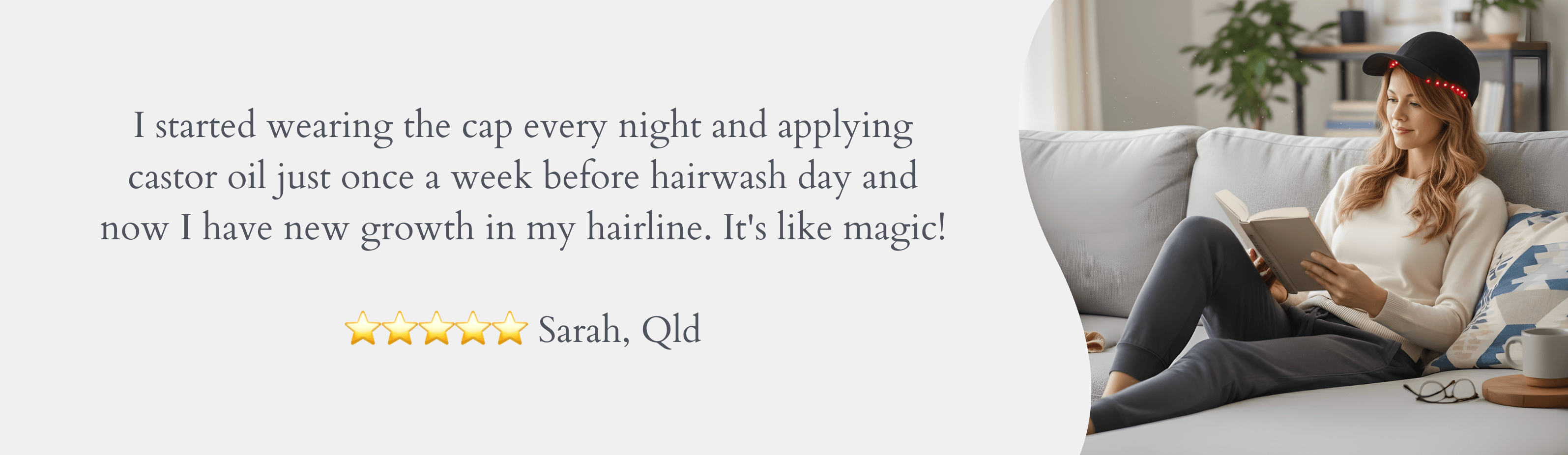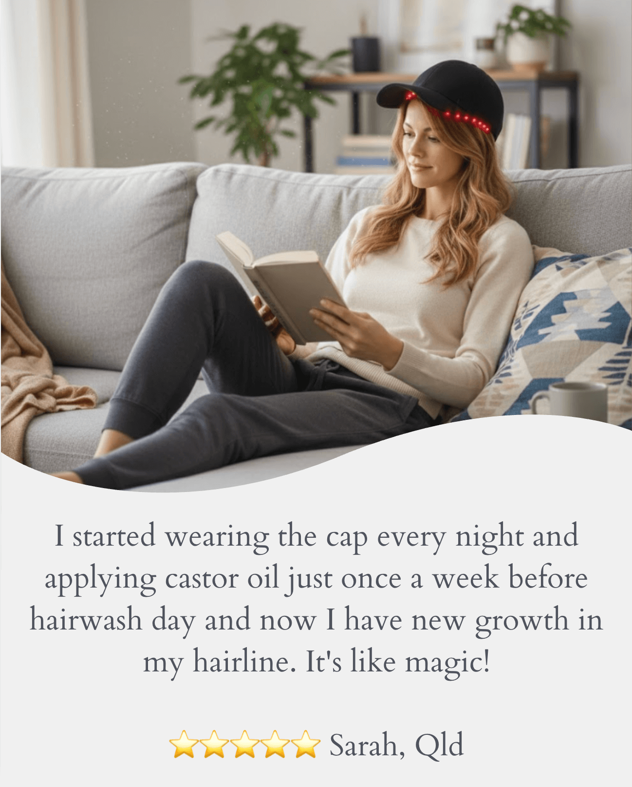 We recommend including our castor oil in your hair care regime - but remember to use it after you have treated your scalp with red light therapy.